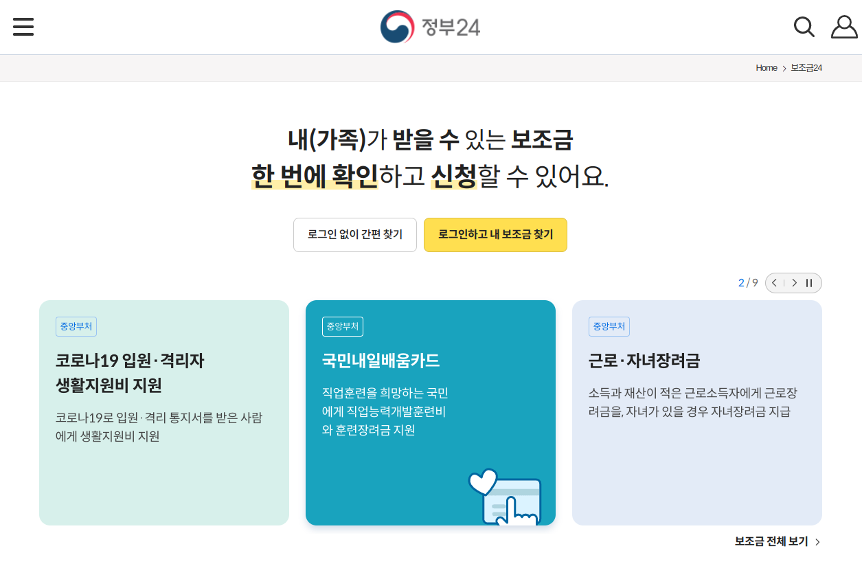 이렇게 한번에 내가 받을 수 있는 지원금을 조회해볼 수 있습니다.