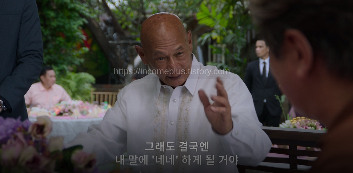 고깃집 사장의 남친은 시장을 찾아갑니다. 빅 보스의 오른팔이 필리핀 시장으로 있으니 뭐 사람하나 죽여도 묻어버리는 건 일도 아닌 걸로 보입니다 1000만 페소의 70%를 요구하는 시장놈은 조폭이랑 짝짜쿵해서 민 회장을 죽여버리라고 오더를 내려버립니다.