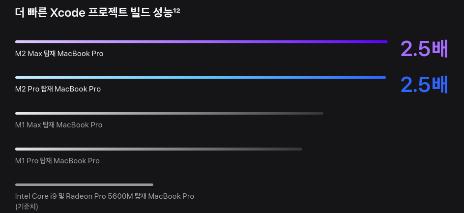 만약 Xcode를 통하 아이폰 애플리케이션을 개발하시는 분들이라면 코드 컴파일 부분에서도 Max와 Pro의 큰 성능 차이는 존재하지 않습니다. 심지어 동일한 성능을 보여줍니다.