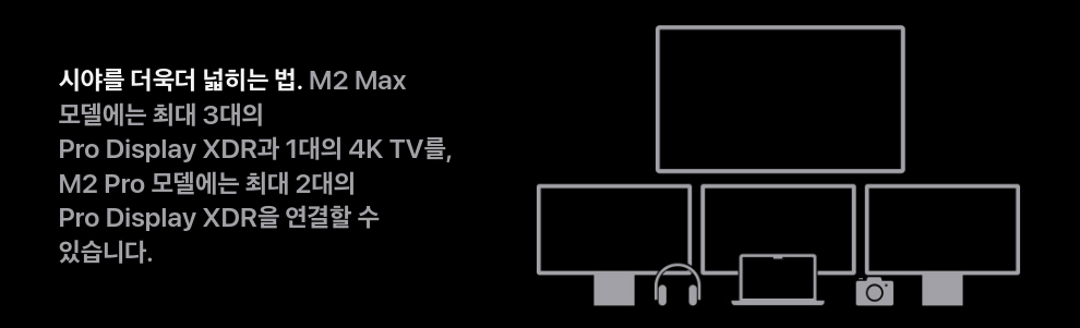 Pro와 Max의 큰 차이점은 외부 디스플레이 연결 대수의 차이점에 있습니다. Pro의 경우 최대 Pro Display XDR을 2대 까지 연결할 수 있는 반면, Max 칩의 경우 최대 3대의 Pro Display XDR에 더해 4K TV까지 총 4대의 외부 디스플레이 연결이 가능합니다.