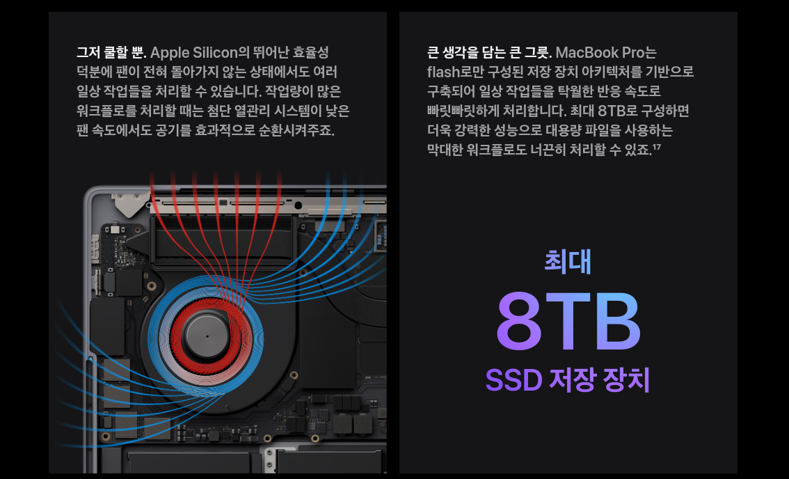 애플 실리콘 Max 칩은 최대 96GB의 통합 메모리를 지원하고 670억개 이상의 트랜지스터가 집적되어 있어 400GB/s의 메모리 대역폭을 지원하고 있습니다. 메모리가 96GB가 지원된다는 내용이 정말 쇼킹합니다. 이제 메모리도 100GB시대에 진입했습니다.