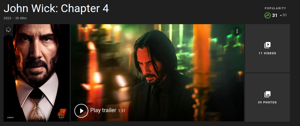 해외 평점 사이트 IMDb에서도 popularity가 올라가면서 전 세계 존 윅 팬들의 기대심리를 옅볼 수 있습니다.