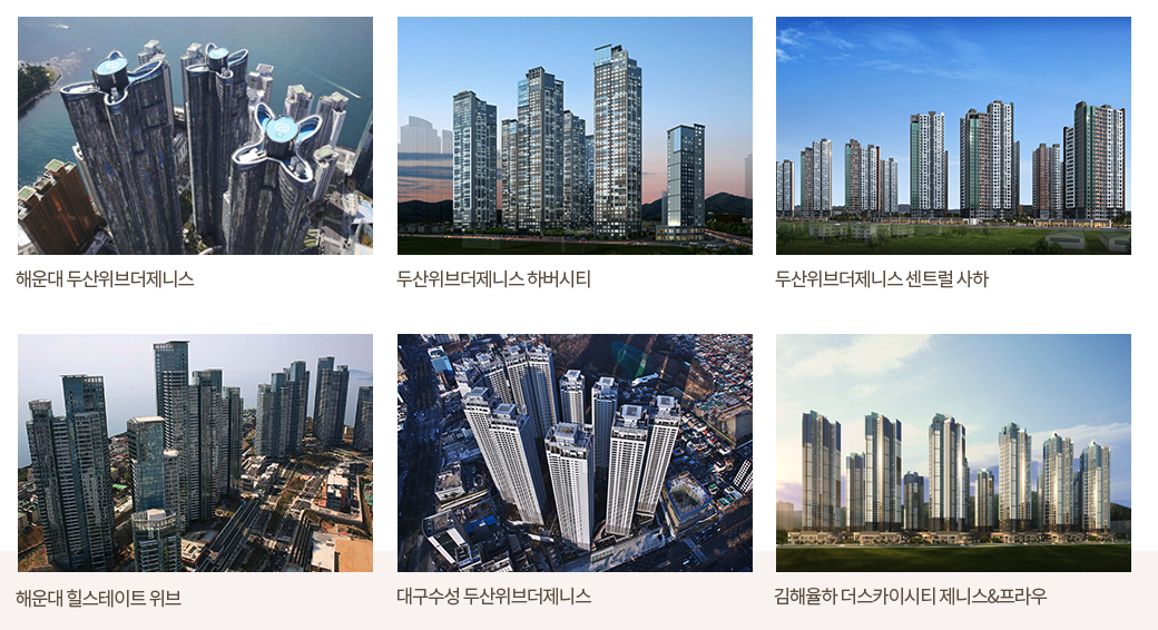 두산건설은 이미 부산에 해운대 두산위브더제니스, 두산위브더제니스 하버시티, 두산위브더제니스 센트럴 사하, 해운대 힐스테이트 위브 등 다양한 아파트 시공을 담당한 건설사입니다. 최근 지어지는 아파트들은 대부분 더제니스 브랜드로 지어지는 트렌드입니다.