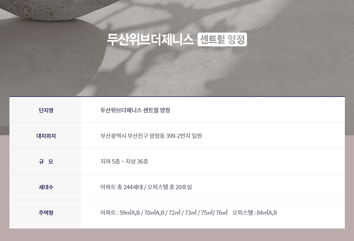 두산위브더제니스 센트럴 양정 사업개요를 보면 총 244세대 아파트와 오피스텔 20호실을 포함해 총 264세대 아파트로 건설됩니다. 지하 5층에서 지상 36층 짜리 건물로 지어질 예정이고, 타입은 59 70 72 73 75 76 그리고 오피스텔 84 타입으로 지어질 예정입니다. 아파트보다 오피스텔 면적이 더 크게 지어지는 건 좀 특이한 콘셉트입니다.