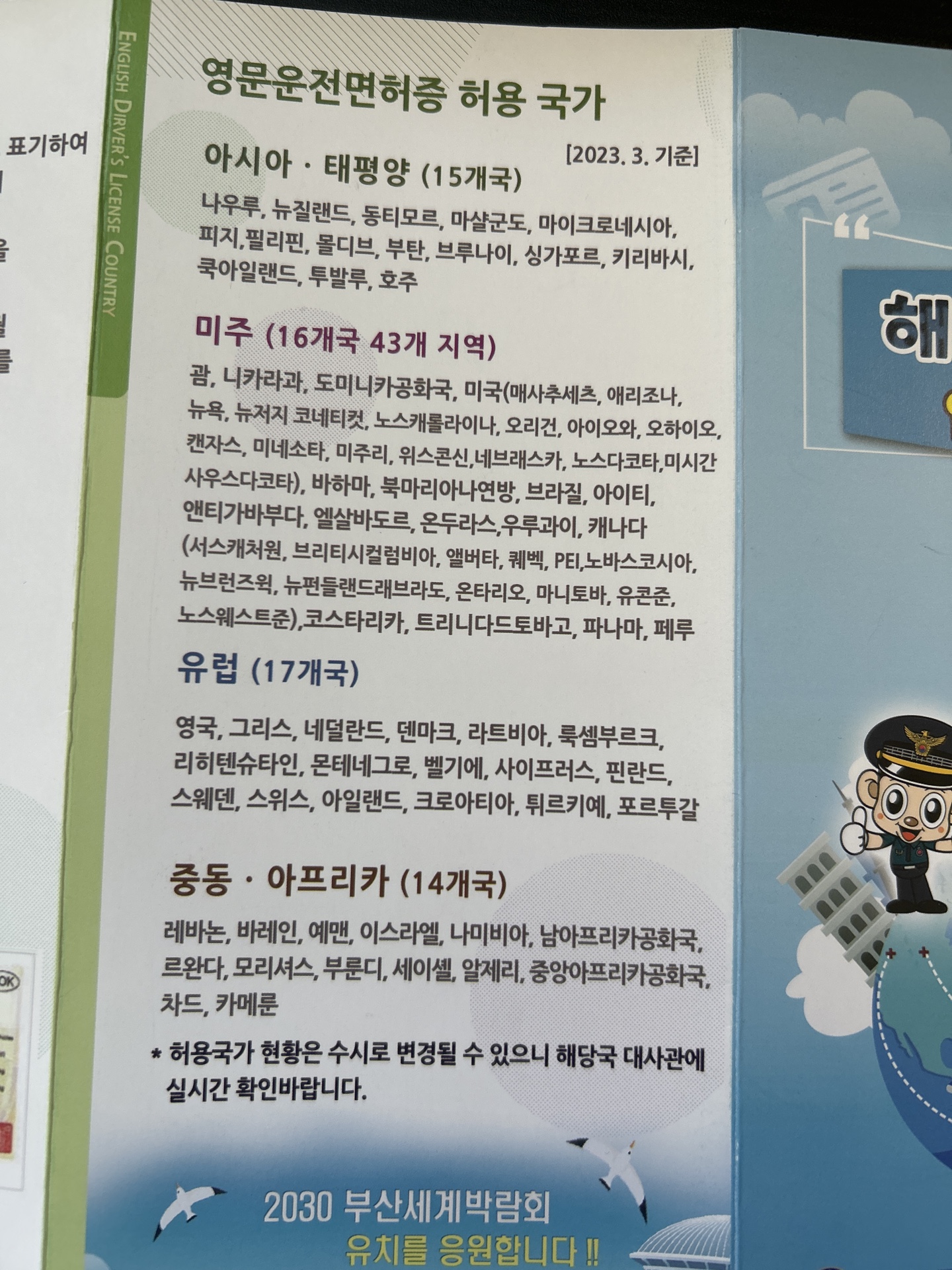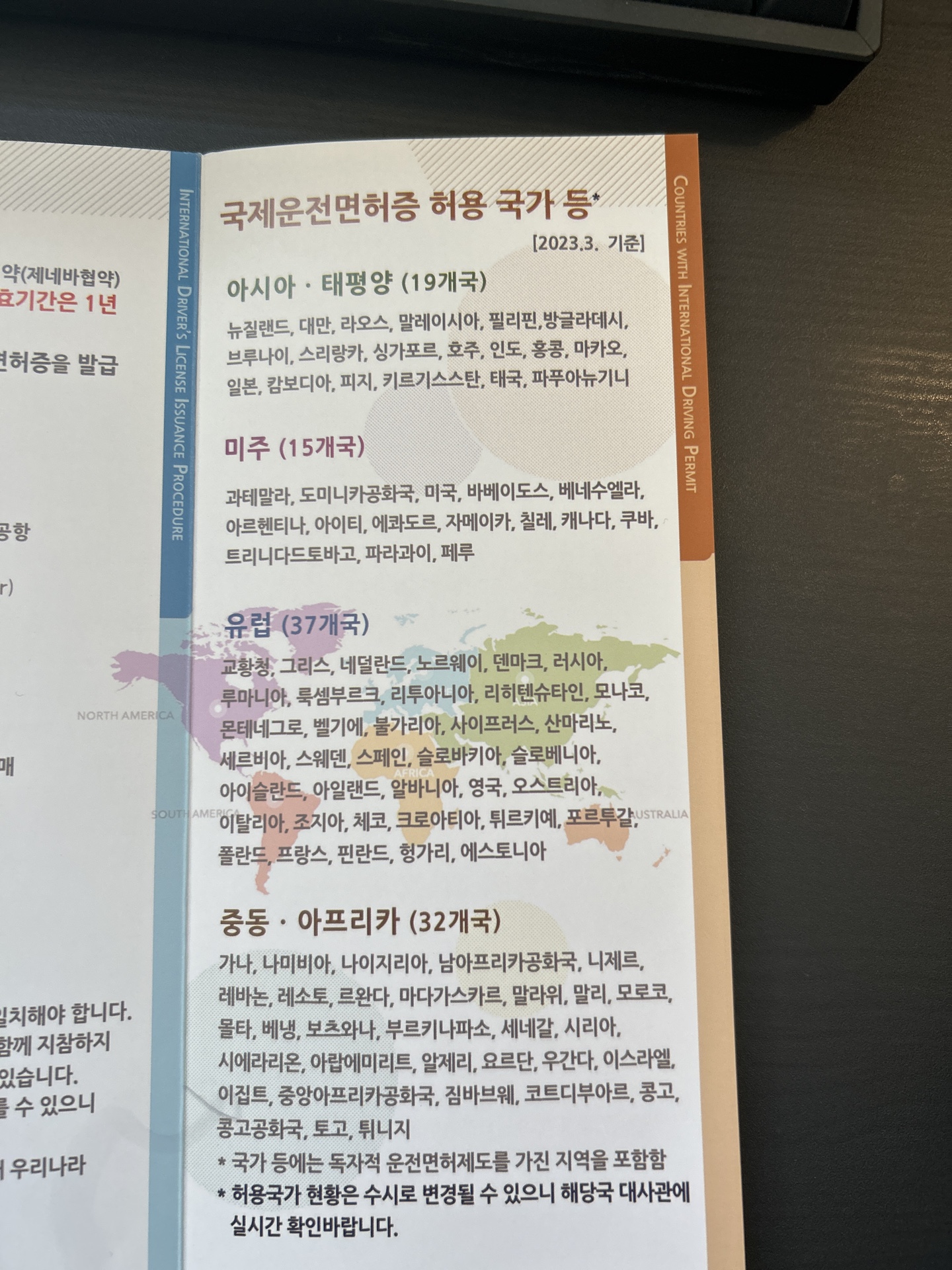 반면 영문운전면허증으로 갈 수 있는 국가는 아시아 15개국(일본 없습니다) 미주 16개국(미국도 주마다 다릅니다) 유럽 17개국, 중동/아프리카 14개국입니다.