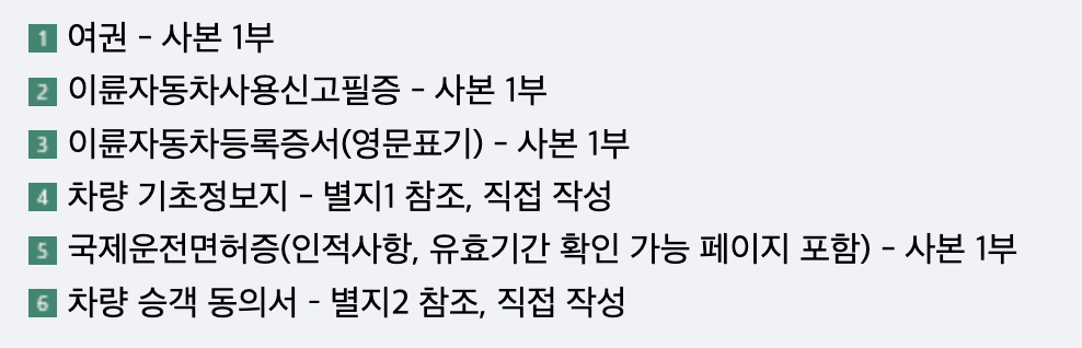 메일로 보내야 하는 서류는 다음과 같습니다. 차량기초정보지 1부와 차량 승객동의서 1부는 홈페이지 양식을 출력해서 작성하면 되고 나머지는 직접 발급을 받아야 합니다. 국제운전면허증은 경찰서나 면허시험장에서, 이륜자동차등록증서 영문표기는 구청에서 발급이 가능합니다. 소재지 관할 경찰서나 구청이 아니더라도 출력은 가능하니 참고하세요.