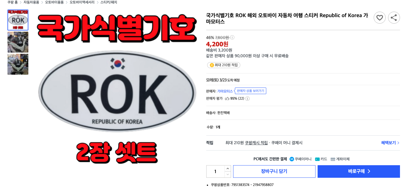 영문 번호판에 더해서 ROK(Republic Of Korea) 스티커도 만들어서 가야 합니다. 아무래도 외국에서 임시반출입된 바이크다 보니 일본 경찰이 보기에 한눈에 알아봐야 되는건지는 모르겠습니다. 이걸 만들어서 판매하고 있으니 만드시기 귀찮으신 분들은 그냥 쿠팡에서 주문하시면 됩니다. 영문번호판은 모르겠지만 국가식별기호(ROK)는 시모노세키 통관시 필요하시 필수적으로 준비하셔야 합니다.