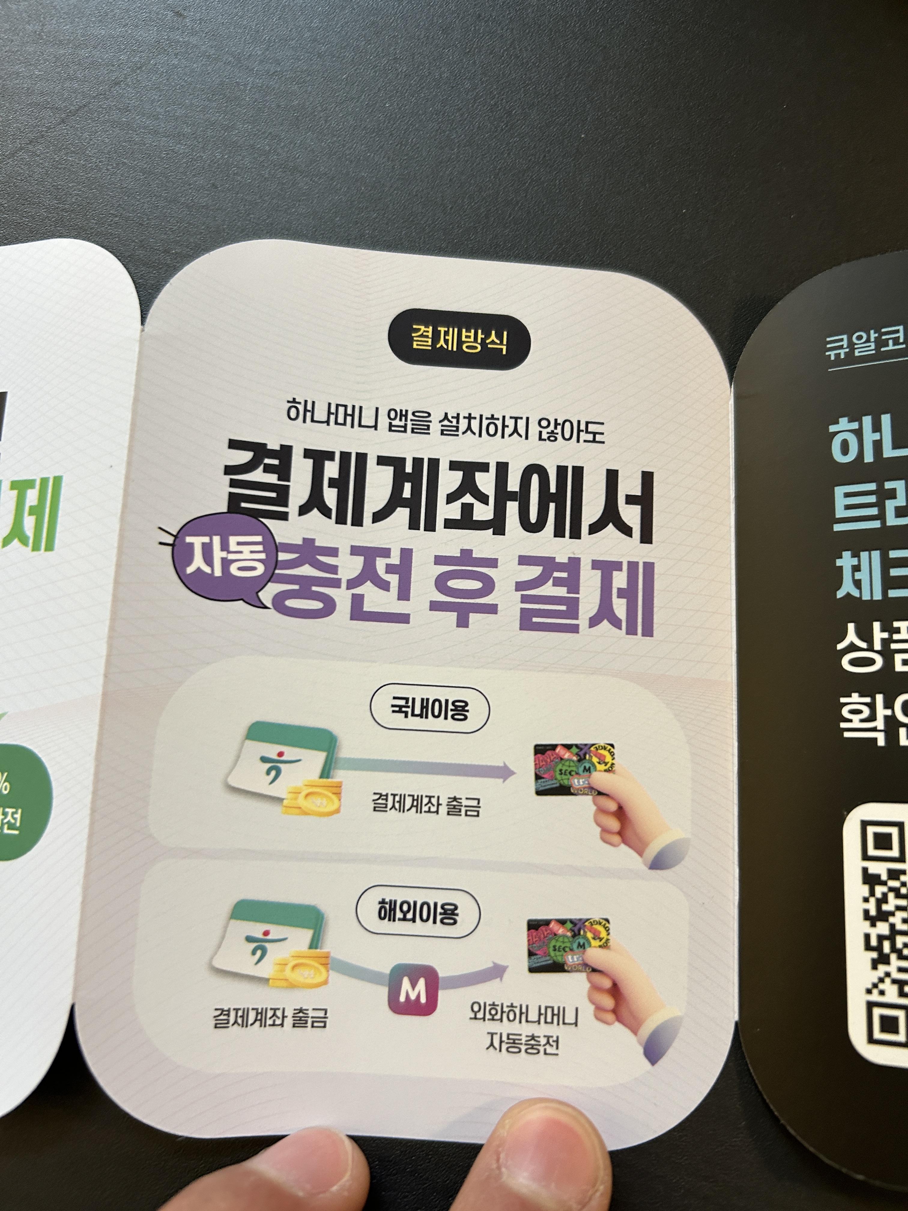 해외 여행 갈 때 만드는 카드라고 해서 국내에서 사용못하는 것도 아닙니다. 하나은행 앱 머니에서 충전 한 다음 국내 가맹점에서도 사용이 가능하며, 교통카드 기능을 추가해서 대중교통을 타는데 이용할 수도 있습니다.