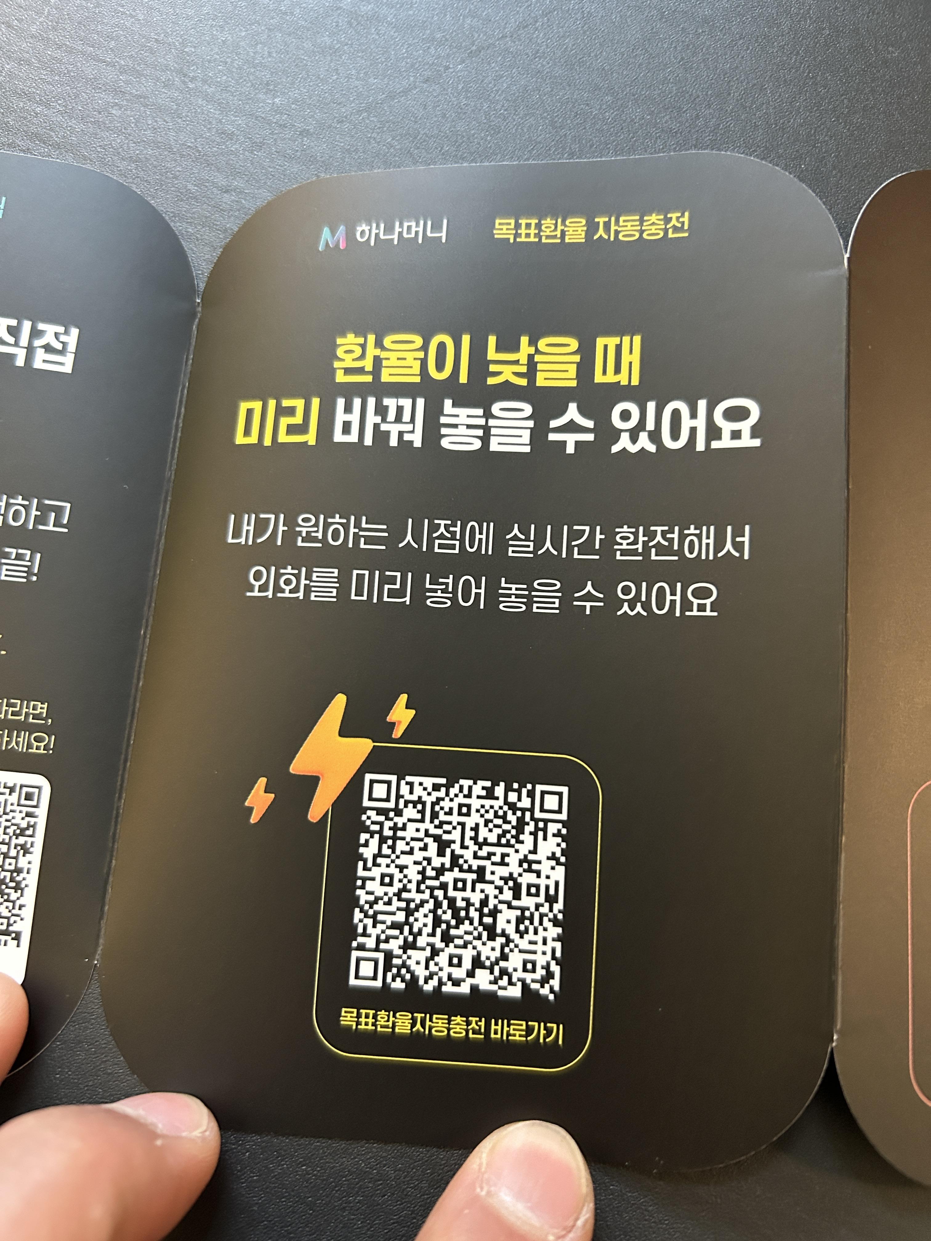 하나원큐 앱에서 하나머니 앱으로 이동하시면 충전이 가능합니다. 하나머니에 있는 돈이 해외에서 결제할 때 수수료 0원으로 바로 출금되는 방식이니 사용할 만큼만 충전해서 사용할 수도 있고, 외화가 저렴할 때(KRW가 비쌀 때) 미리 환전을 해두면서 환투자를 하실 수도 있습니다.