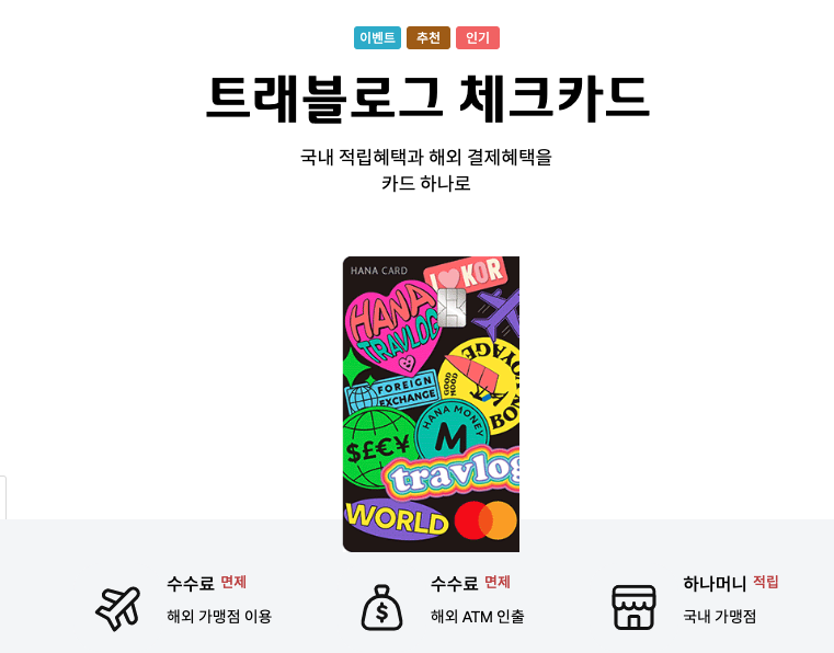 이번 포스팅에서는 해외여행 갈 때 이제는 필수품이 되어버린 하나 트래블로그 카드를 소개해드리고자 합니다. 일반 카드랑 다른점이 뭐냐구요? 현지에서 환전수수료 0원으로 실물화폐를 출금할 수 있다는 점이 가장 큰 장점인 카드 입니다.