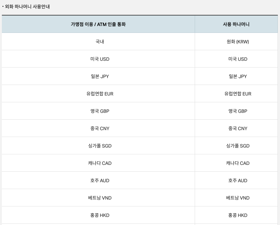 하나 트래블로그 카드는 미국 달러, 일본 엔화 뿐만 아니라 유료화, 위완화, 홍콩 달러 등 다양한 국가의 통화를 지원하고 있습니다.