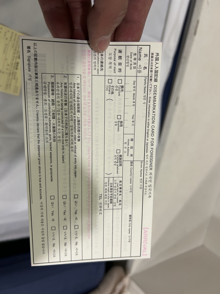 배 안에서는 수출입신고서랑 입국신청서를 작성합니다. 입국할 때 제출해야 되는 카드입니다. 일본 내에 주소지가 없거나 혹은 호텔 주소를 잘 모른다고 하시면 그냥 시모노세키 그랜드 호텔을 적으시면 됩니다. 전화번호는 083-123-4567 이렇게 아무렇게나 적어도 되는데, 숙소 이름이 가장 중요합니다. 시모노세키에서 묵을 주소를 몰라서 왔다갔다 했습니다.