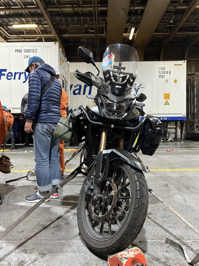 배에 올라타서 조금 기다렸다가 다시 부두로 걸어 내려와서 바이크를 옮깁니다.