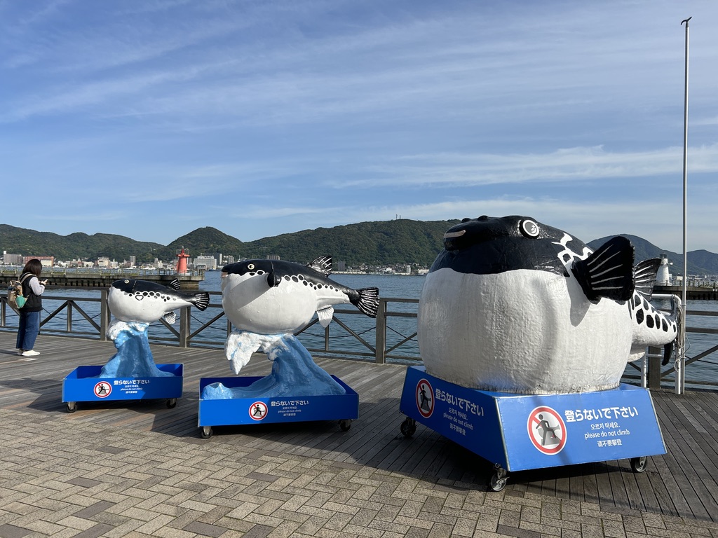 신궁 옆으로는 장례식장도 있습니다. 신궁에서 가족장을 보내는 사람들이 보입니다. 신궁앞으로는 시모노세키에서 어획량이 많다고 하는 복어가 많이 보입니다. 일본 전역에서 복어 요리가 가장 유명하다고 합니다.
