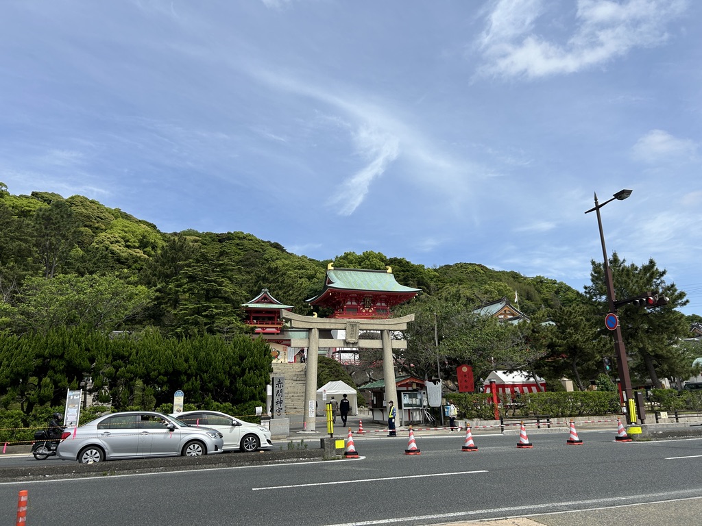 우선 부두에서 내려와서 아카마신궁으로 향합니다. 빨간 건물이 특징인 이곳은 일본의 안토쿠 천황을 모시고 있는 신사입니다. 신사가 빨간 이유는 류구 양식이라고 해서 해신의 궁전을 표현하기 위함입니다.