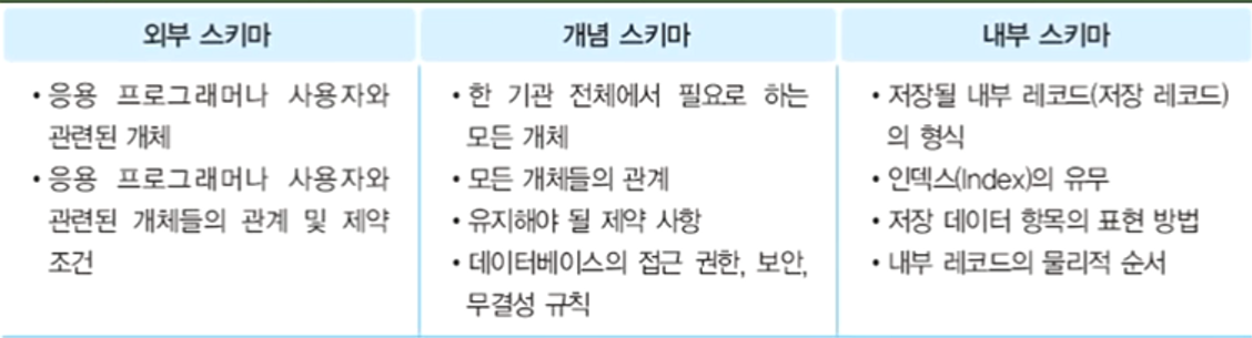 - 스키마 : 데이터 조건값에 대한 정의를 의미한다.