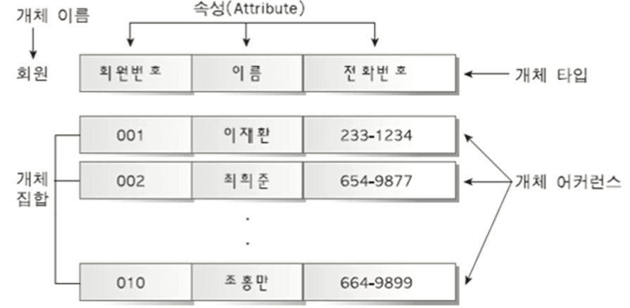 - 개체 Entity 정보를 나타내는 논리적 단위 / 파일 시스템의 레코드에 해당 / 속성이 모인 집합/ 개체는 단독으로 존재한다. / 모든 개체는 구별이 가능하다.