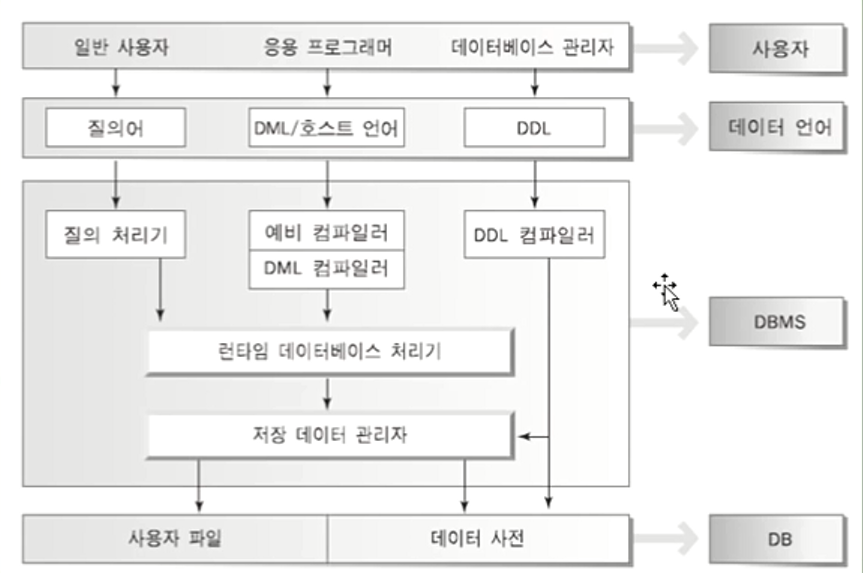 - 질의처리기(Query Process) : 사용자가 요청한 질의어를 데이터베이스 로우레벨로 변경
