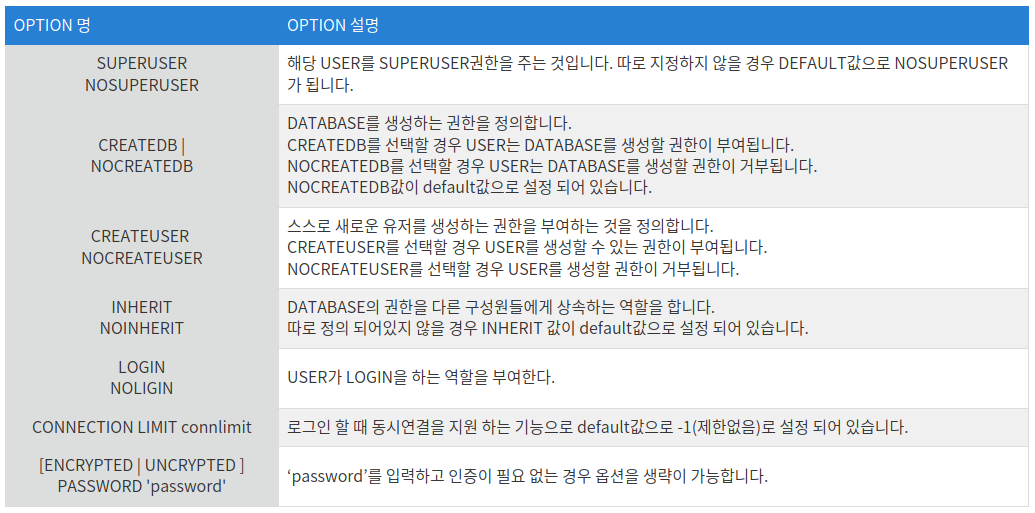 CREATE USER 'name' PASSWORD 'password' OPTION