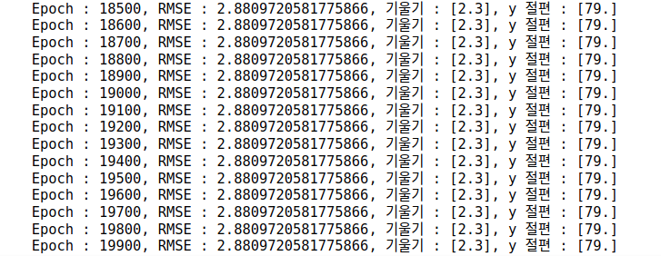 print("Epoch : {0}, RMSE : {1}, 기울기 : {2}, y 절편 : {3}".format(step, sess.run(rmse), sess.run(a), sess.run(b)))