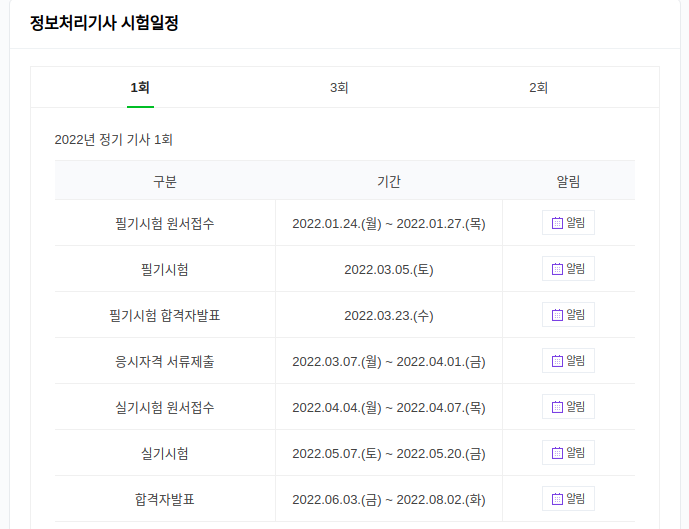 2022 정보처리기사 시험일정은 다음과 같다. 2022 정보처리기사