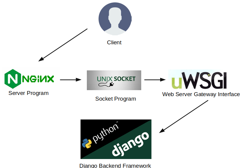 Nginx가 돌아가고, unix socket을 사용해서 uWSGI가 Django로
