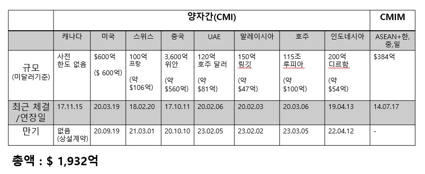 중앙은행간 통화스왑은 통상 외화자금시장의 통화스왑 보다는 단기간의 계약으로 1년 미만의 계약을 체결하게 되며 계약기간 동안 이자의 교환은 발생되지 않으며 만기시 원금과 이자를 한번에 상환하는 구조입니다. 금번 계약 또한 최소 6개월 약정의 기간으로 체결되었습니다. 통화스왑 계약 국가의 수에 따라 양자간 통화스왑(CMI), 다자간 통화스왑(CMIM)으로 분류됩니다. 한국은 캐나다, 스위스, 중국, 호주, 말레이시아, 인도네시아와 양자간 통화스왑을 맺고 있으며, ASEAN, 중국, 일본등 12개국과 CMIM(다자간 통화스왑)을 체결하고 있습니다. 통화스왑은 만기에 따라 한시적 통화스왑, 상설통화스왑으로 분류됩니다. 한국도 미국과 일본등 기축통화를 사용하는 국가들과 상설통화스왑을 체결하면 좋겠지만 경제력의 차이로 인해 현재는 불가능합니다. 다만 한국의 경우 캐나다와 상설통화스왑을 체결하여 외환시장 안정화에 기여하고 있습니다.