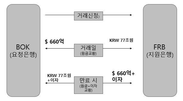 한국은행등 각 정부의 중앙은행들은 금융위기 발생시 통화스왑을 서둘러 체결하여 시장을 안정화 시킵니다. 통화 스왑이란 각 국의 통화를 필요로 하는 국가 혹은 기업간 외화자금조달, 환리스크 관리, 금리차익 추구등의 목적으로 이루어지는 계약입니다. 통화스왑은 거래 당사자간 통화를 교환하고 만기시 원금에 이자를 더한 금액을 교환하여 각국의 통화가치 보존, 국제 거래신용도 증대등을 목적으로하는 거래 형태입니다.