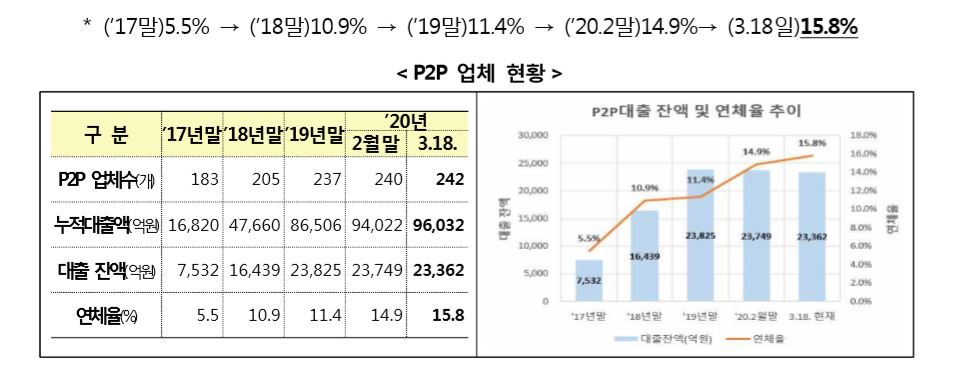 최근 아파트 매매가격이 큰 폭으로 상승하면서 P2P 소액 부동산 투자 규모가 확대되고 있습니다. 2017년 정도부터 P2P투자라는 이름으로 개인 혹은 소액 투자가 급증하게 되었습니다. 너도나도 저금리 상황에서 좀 더 높은 수익을 얻기 위해 P2P투자를 시작하면서 최근 P2P투자, 특히 소액부동산 투자 상품의 연체율이 15%를 넘어서고 있습니다. 2017년 경 0.8조원이었던 P2P대출 규모가 최근 20년 2월 경 2.4조원으로 확대되면서, 금일 금융위원회에서는 급증하는 P2P투자 연체율에 대한 경고소비자 경보를 발령하였습니다.