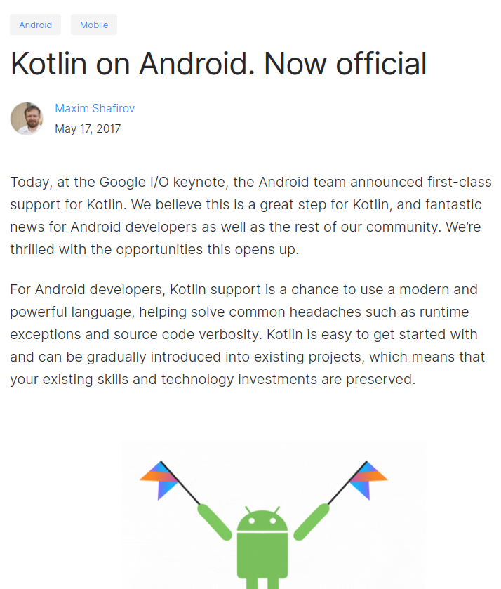 Kotiln이 정식 출시된 건 2011년이다. 사람들에게 폭발적인 관심을 받기 시작한 건 2017년 부터다. 구글에서 안드로이드 애플리케이션을 빌드하는데 좋은 언어로 Kotlin을 추천하기 시작했기 때문이다. first-class 언어로 구글에서 선정한 것은 그만큼 안정성과 개발 비용절감에 도움이 된다는 것이다.