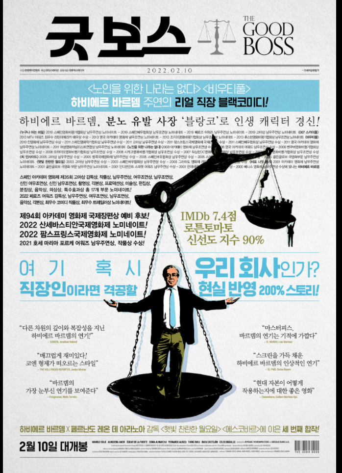 굿보스 영화는 잔잔한 드라마 장르다. 다이내믹한 액션은 없지만 인물간의 갈등, 생각지도 못한 사건들의 연속으로 영화의 긴장감은 올라가고 마지막으로 우수기업상을 받으면서 긴장감은 최고조가 된다. 인간의 양면성을 제대로 드러낸 영화고, 영화 듄에서 스틸거 역으로 출연했떤 하비에르 베르뎀의 블랙 코미디 또한 인상적인 영화다.