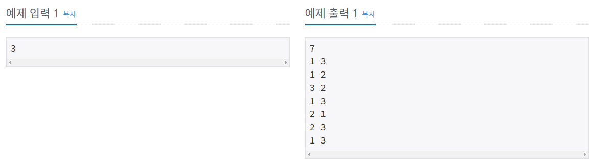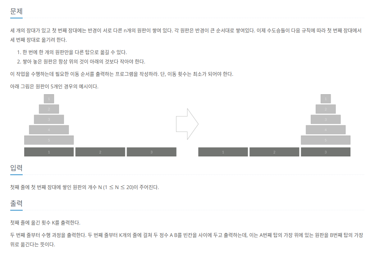 백준 알고리즘 11729번 문제는 워낙 유명한 문제라서 알고리즘 강의에 꼭 등장하는 예제다. 핵심은 n개의 원판을 옮기는 문제를 원반 n-1개를 이동하는 문제로 나누는 과정을 재귀함수로 구현하는 것이다. 최종적으로 옮겨야 되는 원판이 1개가 되었을 때 이동해야 할 경로를 출력하고 복귀하게 된다.