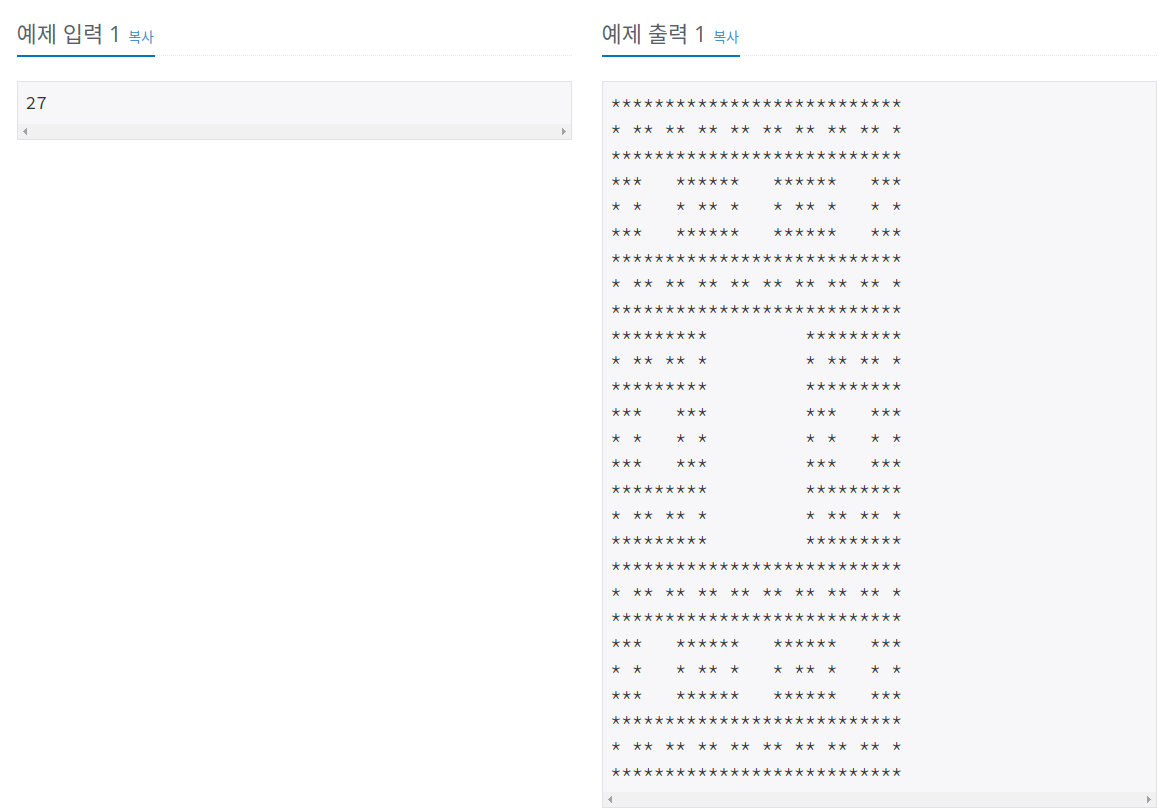 재귀 조건은 두가지로 분기된다. 출력 그래프의 값은 '*'과 공백으로 구분된다. 입력값 3에 대해서 (0,0) (0,1) (0,2) (1,0) (1,1) 순서로 진행되게 되며 (1,1)의 순서에서 공백이 출력된다. 입력값 9는 입력값 3의 그래프가 반복되는 것이고 입력값 27도 마찬가지기 때문에 재귀를 돌면서 5번째의 경우 공백을 출력할 것인지, 별을 찍을 것인지에 대한 조건을 달아줘야 한다.