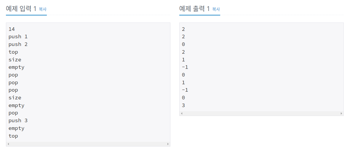 PUSH, POP, EMPTY, SIZE, TOP 메소드를 개별적으로 구현해 준 뒤 MAIN 메소드에서 FOR문을 순회하면서 연산한다. 출력값은 StringBuilder에 APPEND 한 후 한번에 출력한다.