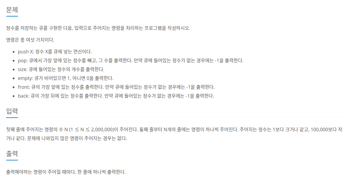 백준 알고리즘 18258번은 선형 순차 자료구조 중에서도 큐(Queue)를 구현하는 문제다. 큐(Queue) 자료구조를 일반적으로 구현하면 간단하게 구현이 가능한데, 백준 알고리즘 18258번을 통해서 구현하게 되면 시간초과 문제 때문에, StringTokenizer, BufferedReader 객체를 반드시 사용해야 한다.