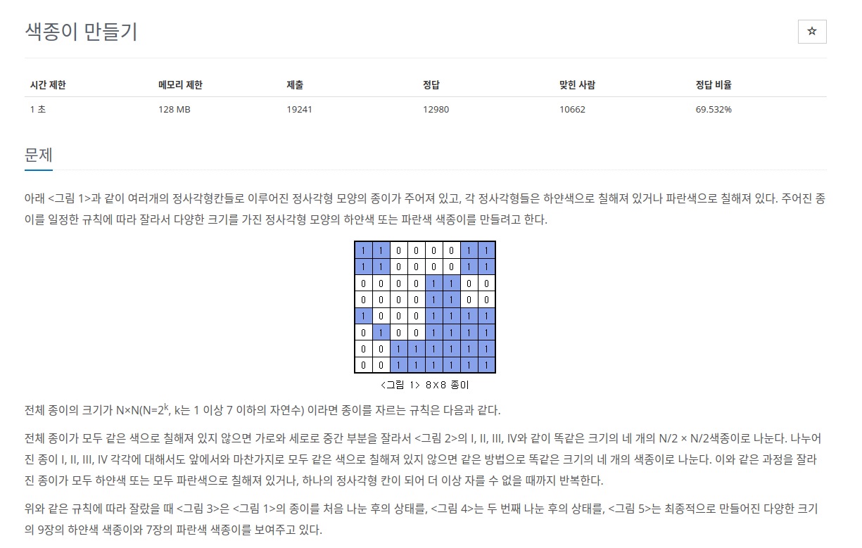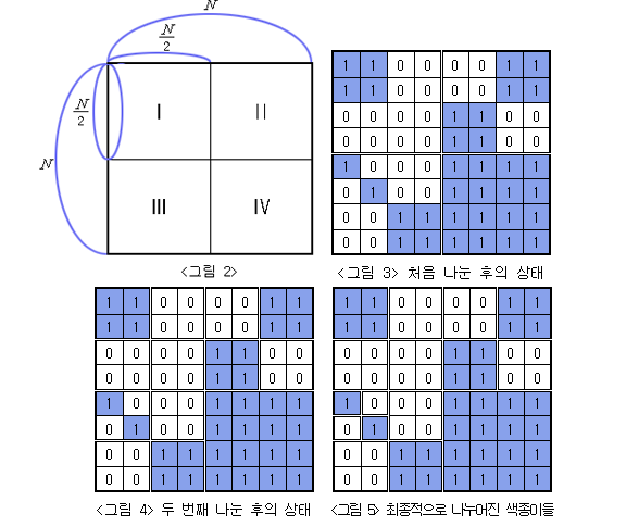 색종이를 쪼개는 방법은 2의 지수승으로 구성된 정사각형에 들어있는 숫자가 모두 동일하지 않으면 N/2 * N/2 색종이로 자르게 된다. 이 과정이 반복 되면서 전체 정사각형의 색종이를 자르는 방법이다.