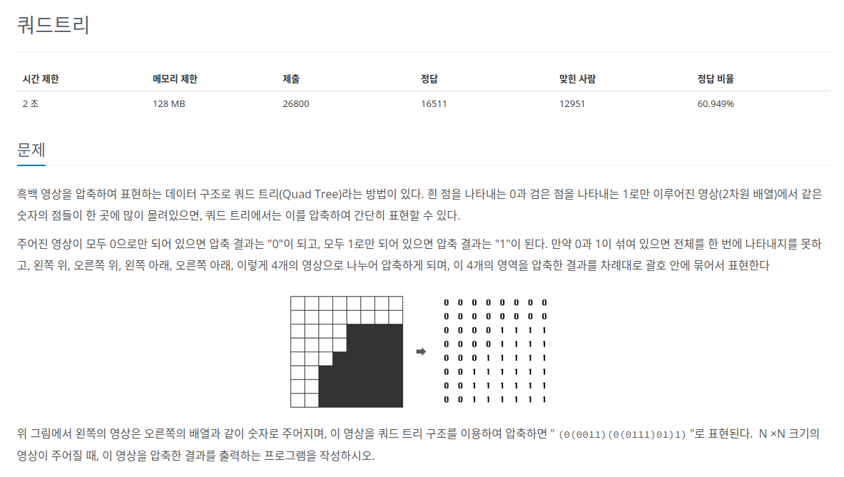백준 1992번 쿼드트리 알고리즘은 분할정복 알고리즘 시리즈다. 전체의 문제를 작은 단위로 쪼개는 작업이 첫번째로 고려되어야 한다. 백준 1992번에서 제시된 쿼드트리는 압축 알고리즘으로 사용되는 방법 중 하나다. 동일한 점들이 모여있는 곳을 압축해서 간단하게 표현하는 방법이다. 쿼드 트리는 4개의 자식노드를 가진 트리구조다.