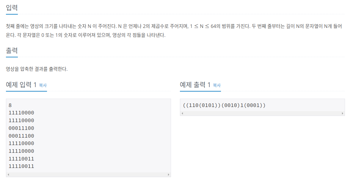 분할정복 문제 중 백준 2630번 색종이 문제 알고리즘은 입력값이 공백이 포함된 숫자값이 였지만 백준 1992번 쿼드트리 알고리즘은 공백이 없는 숫자가 입력값으로 주어진다. String 클래스에서 charAt() 메소드를 이용해서 특정 위치의 값을 파싱하는 작업을 따로 거친다.