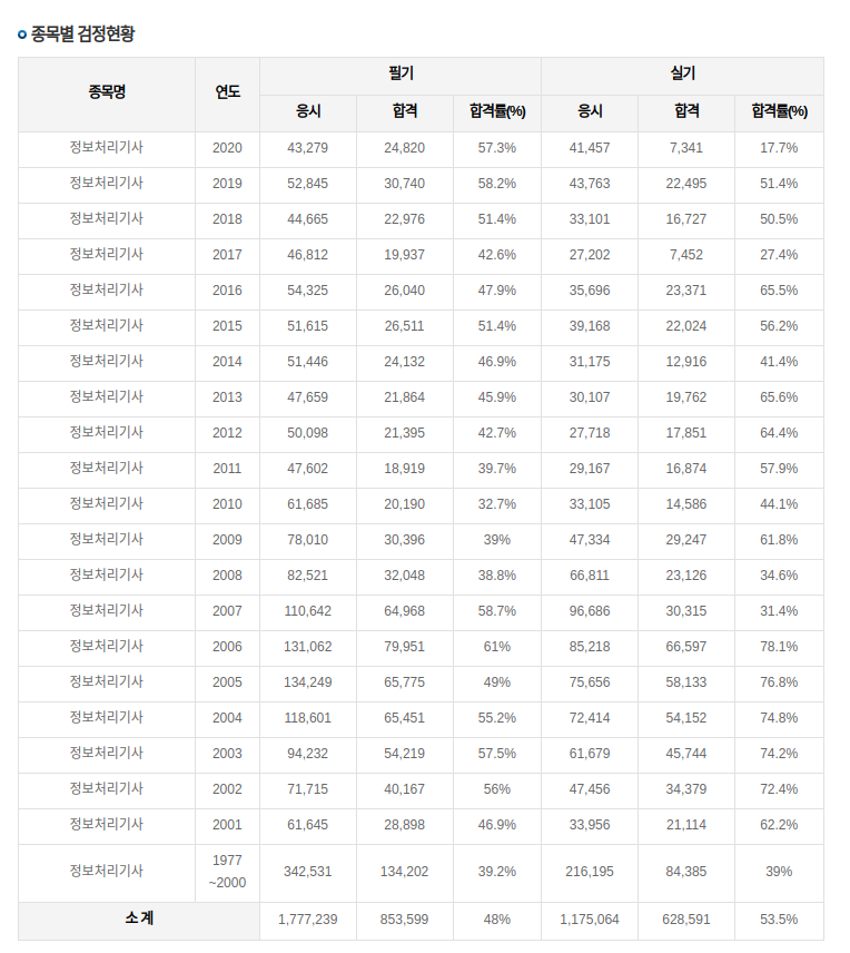 필기 시험 합격자들은 바로 응시자격 서류를 제출해야 한다. 실기시험 접수 전까지 응시작격 서류제출이 되지 않으면 필기시험 합격 사실이 취소된다고 한다. 2020년 기준 정보처리기사 필기 합격률은 약 50% 정도다. 응시자격 서류 미제출+당일 미응시자를 합치면 실질적인 합격률은 60% 이상 된다고 본다.
