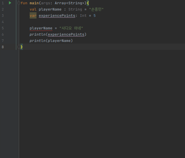val 키워드와 var 키워드 두개를 사용해서 변수를 선언한다. 이후 playName에 할당된 손흥민 값을 사디오 마네로 변경하면 Error가 발생한다.