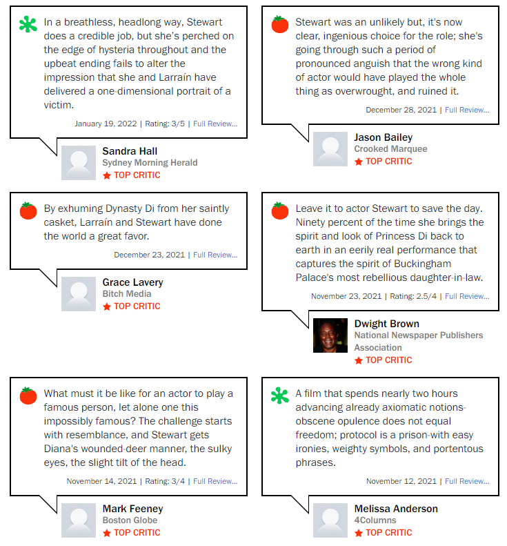 영화 스펜서 해외 반응 또한 크리스틴 스튜어트의 내면 연기에 대한 호평이 많다. 버킹엄 궁전에서 가장 반항적인 며느리의 모습에 스튜어트의 연기가 적합했다는 반응들이다. 영화 스펜서에서 연출된 다이내나는 각색이 포함되어 있다고 한다. 그럼에도 불구하고 공간과 배우들의 연기에서 무거운 암시와 메시지를 던지는 영화다.