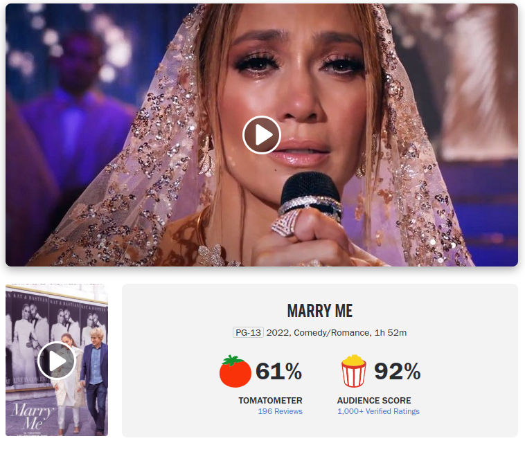 로튼 토마토 기준 신선도 61점과 팝콘 지수 92점을 기록하고 있다. 미국에서는 2월에 개봉한 영화이기 때문에 이미 팝콘지수가 상당히 높히 올라가 있다. 영화 메리 미 평점단들은 "스윗하다" "제니퍼 로페즈의 진가를 볼 수 있는 영화다" "오웬 윌슨과 제니퍼 로페즈의 케미가 돋보인다"등의 평을 남겼다.
