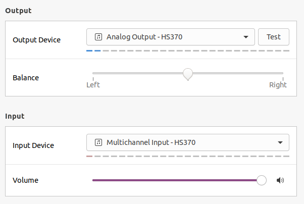 settings->sound에 들어가면 Output Device에는 Analog Output-HS370이