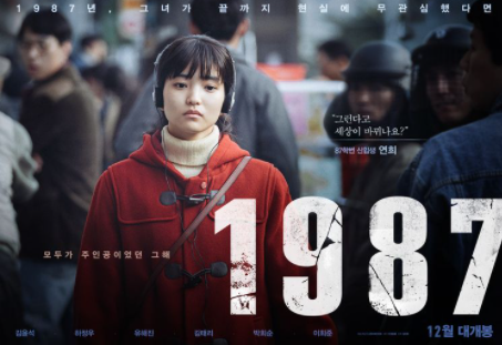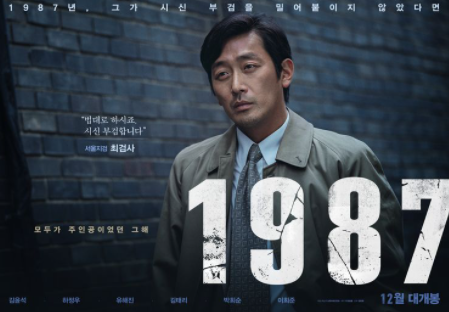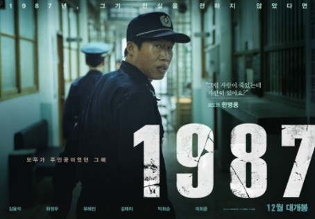 2017년 12월 27일 개봉한 영화 1987은 장준환 감독이 메가폰을 잡은 영화다. 출연진으로는 하정우, 김윤석, 김태리, 강동원, 박희순, 박지환, 이용직, 박지홍, 설경구, 겨진구, 문성근, 오달수, 문소리 등의 레전드 배우들이 대거 출연한 영화다. 평점 9.31점을 받으면서 역사성, 작품성, 흥행성을 모두 갖춘 영화다. 누적관객수 700만명을 동원하면서 큰 인기를 얻었으며, 1987년 당시 박종철 서울대 학생의 사망 사건을 실화로 모티브로 하여 만들어진 영화다.