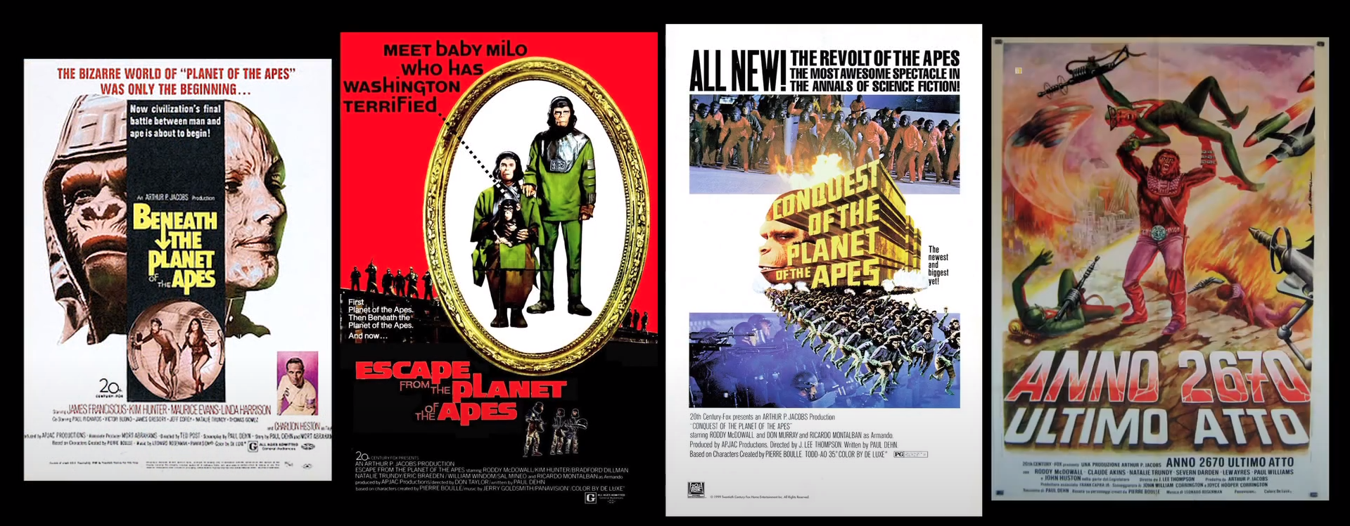 혹성탈출 시리즈 시초인 <혹성탈출>은 제작비의 15%가 유인원분장에 투입되면서 아카데미에서 분장상이 새로 신설되기 까지 했다. 인간이 유인원에게 지배당한다는 충격적인 결말로 이어지면서 영화는 큰 흥행에 성공하면서 4편의 속편이 만들어지고 TV 시리즈까지 제작되게 된다.
