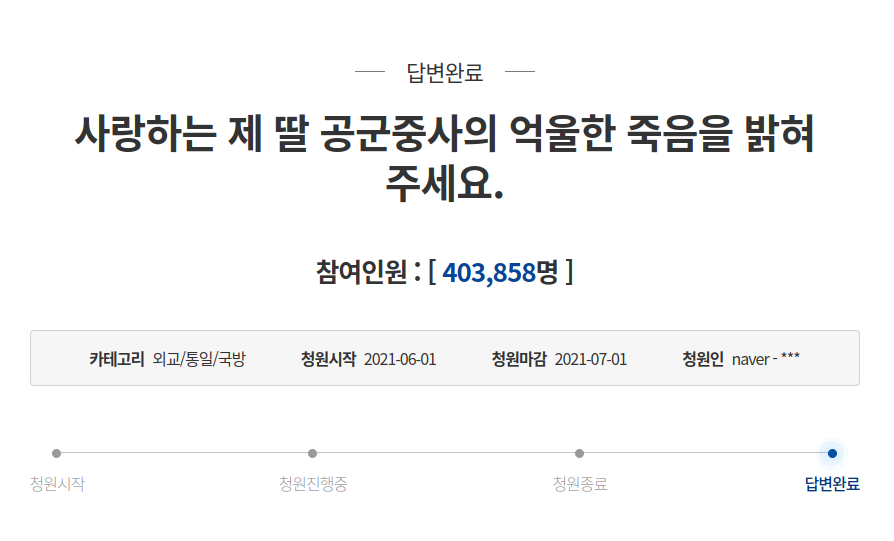 결국 억울한 딸의 죽음을 밝혀달라는 호소문을 청와대 국민청원 게시판에 올렸고, 유가족의 호소는 40만명의 동의를 얻으면서 수사의 탄력이 붙는 듯 했다. 대통령이 직접 나서서 대대적인 수사를 지시했고, 공군 창군 이래 최초로 특임검사가 임명되고, 수사심의위원회까지구성된 것이다. 그럼에도 불구하고 해를 넘기면서 수사기간은 길어질 뿐인데, 과연 무슨 일이 일어나고 있는 것일까?