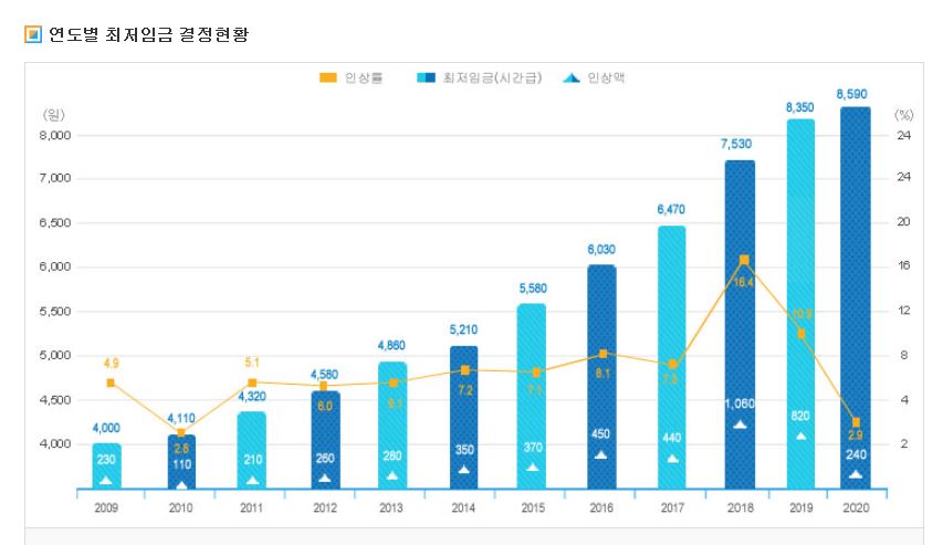 우리나라에는 최저임금제도가 있다. 이는 국가가 노동시장에 직접 개입하는 예외적인 제도인데, 헌번 제32조 제1항을 보면 사용자에게 최저 수준의 임금기준을 강제함으로써 근로자의 최저생계를 보장한다는 것이다. 사실 최저임금제는 1953년에 근로기준법을 제정하여 시행기준을 마련하였음에도 불구하고, 당시의 한국의 GDP는 47만 원,인당 GDP는 2,300원이었음을 고려하면 최저임금제도로 근로자를 보호하기보다는 국가 경쟁률을 제고하는 것이 타당한 것인지도 모르겠다. 최저임금제도는 매년 개선되어오면서 2020년에 들어 8,590원으로 정해졌다. 이는 현 정부가 들어선 이후 140%가 상승된 부분이다.
