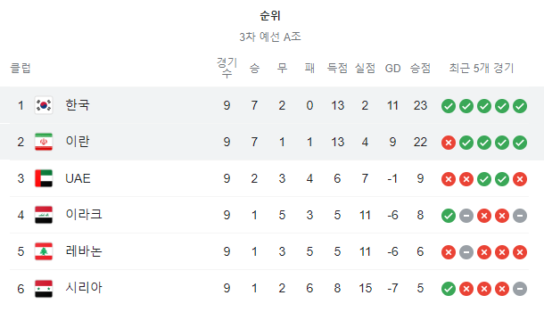 한국대 이란에서 2:0 대승을 거머쥐면서 한국 축구의 위상이 상당히 달라졌다. 독일과 2:0으로 이긴 타자의 기적과 동일하게 김영권과 손흥민이 순서만 바꿔서 1골씩 기록하면서 이란과 역대스코어에 큰 변화가 생겼다. 이제 3월 29일 격돌하는 UAE와의 대결만을 앞두고 있는 상황이다. 월드컵 예선에서 한국은 승점23점을 거머쥐면서 조1위에 랭크되었다. 과연 마지막 까지 1위를 유지할 수 있을까?