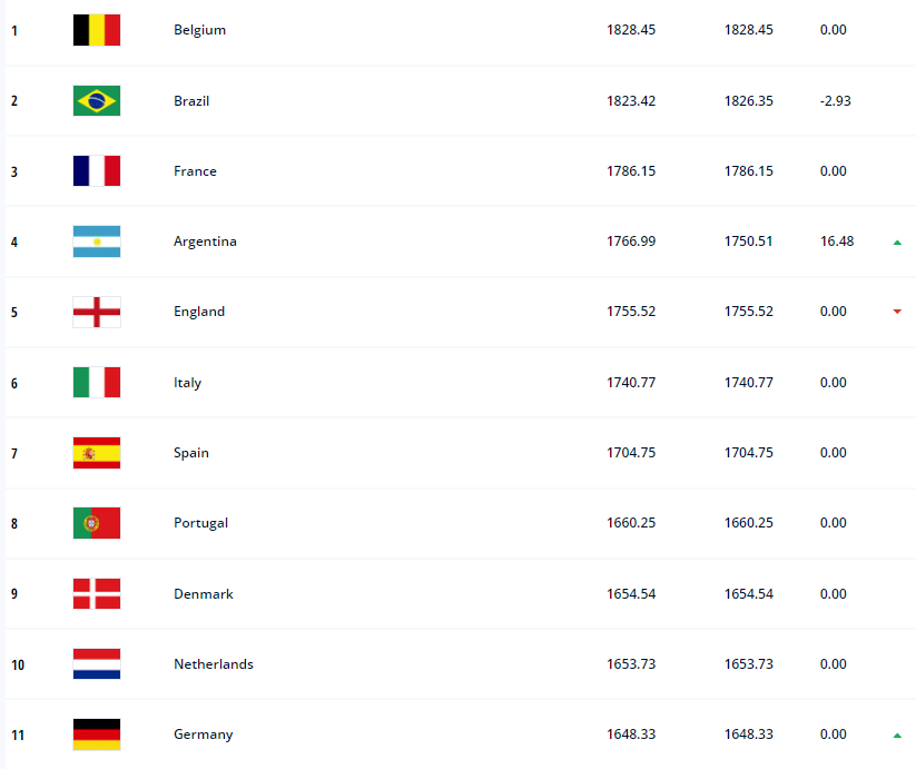 현재 피파 월드 랭킹 1위 국가는 벨기에다. 2위가 브라질이고, 월드컵에서 강한 경기력을 보여주는 독일은 11위에 랭크되어 있다. 한국은 29위에 랭크되어 있다. 이상한게 23위인 일본보다 더 랭크가 낮다. 개최국인 카타르는 52위에 랭크되어 있다.