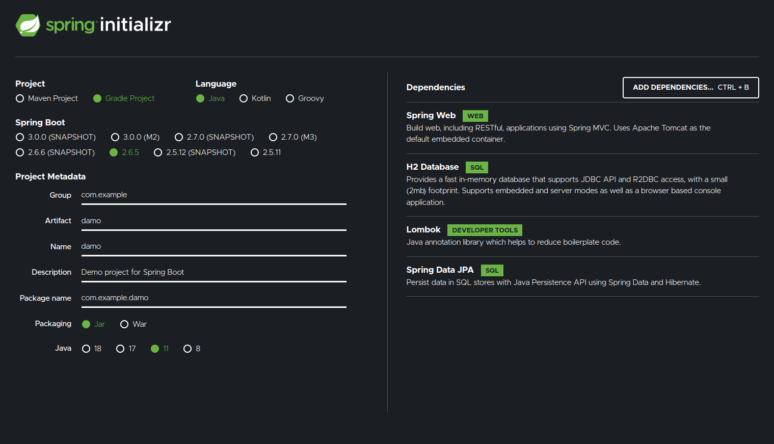 스프링 프로젝트는 스프링 부트에서 제공하는 환경구성 툴을 사용한다. Spring Initializer에서는 project, Language, Spring Boot Version, Project Metadata, Dependencies를 설정해서 빠르게 프로젝트를 실행할 수 있다. Dependencies에는 <Spring Web><Spring Data JPA><H2 Database><Lombok>정도 추가해서 프로젝트를 생성한다.